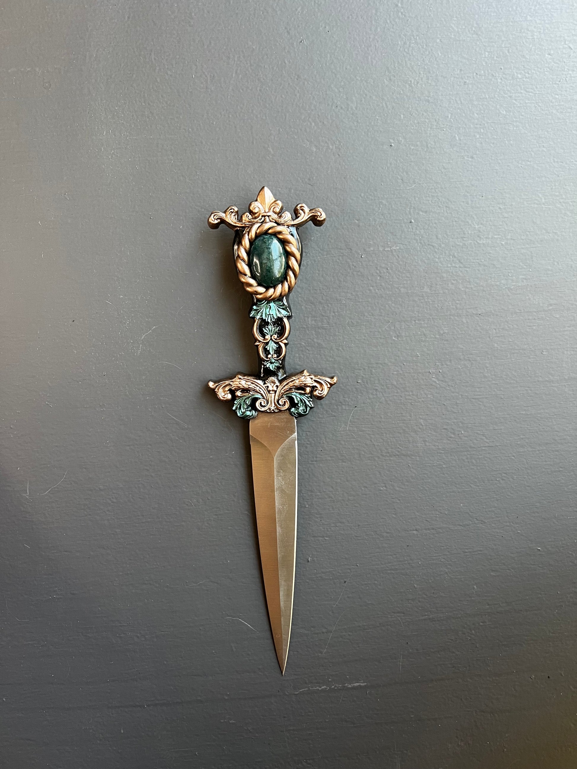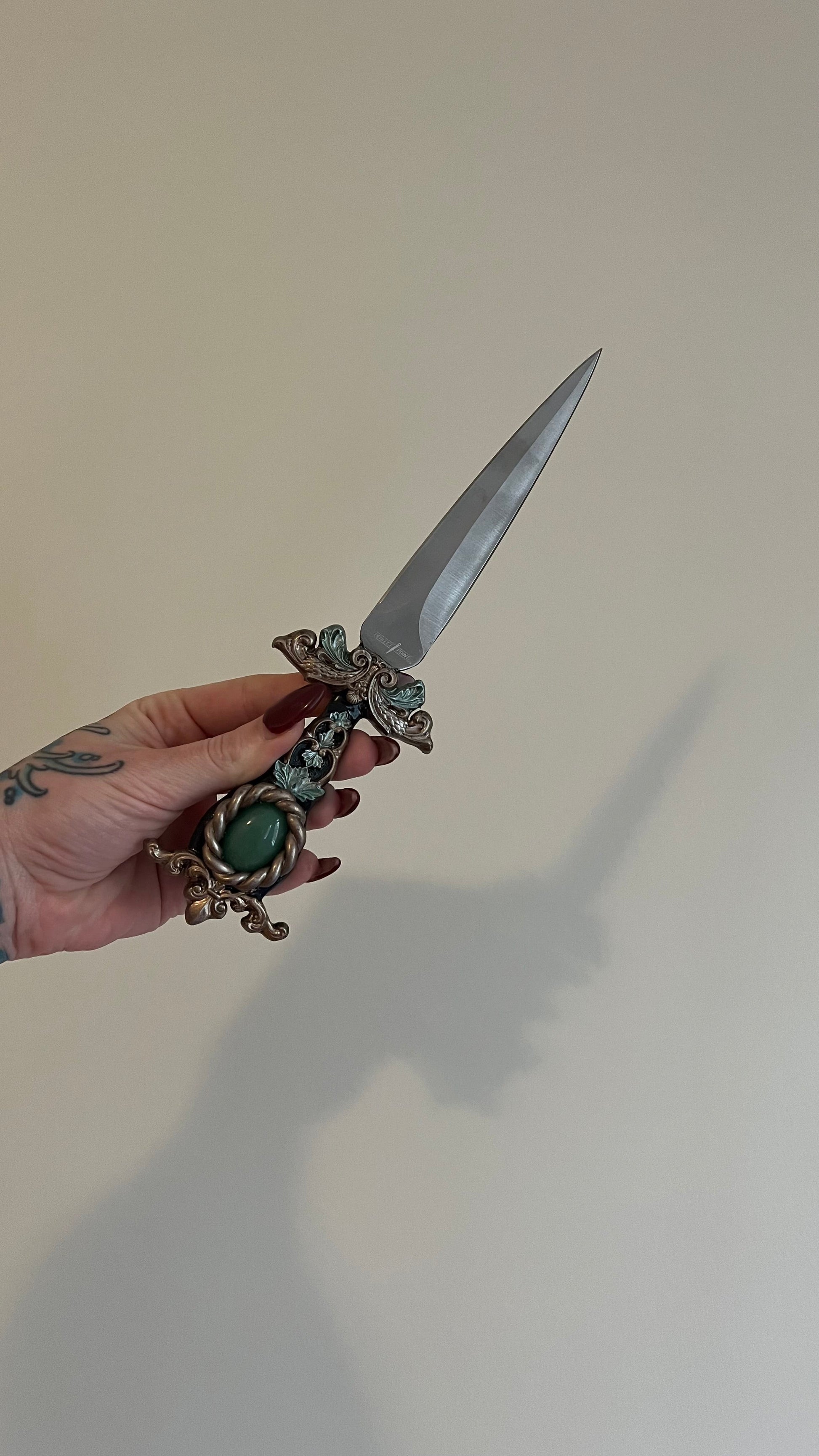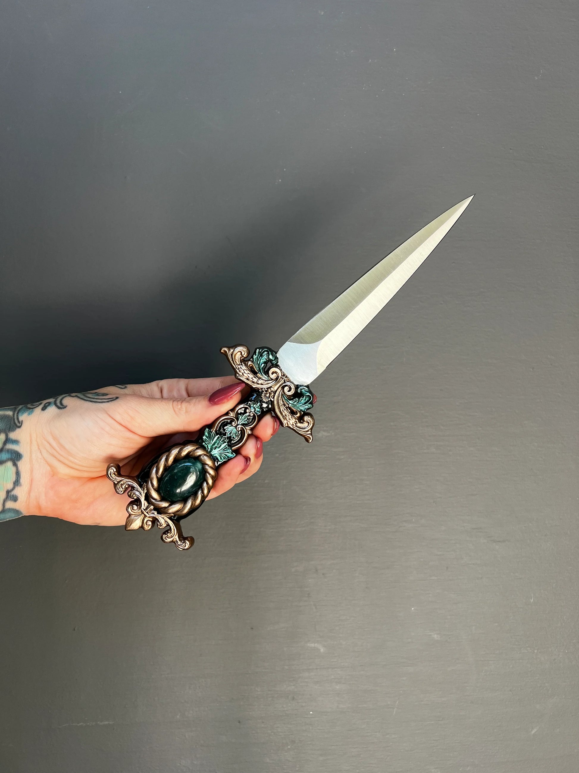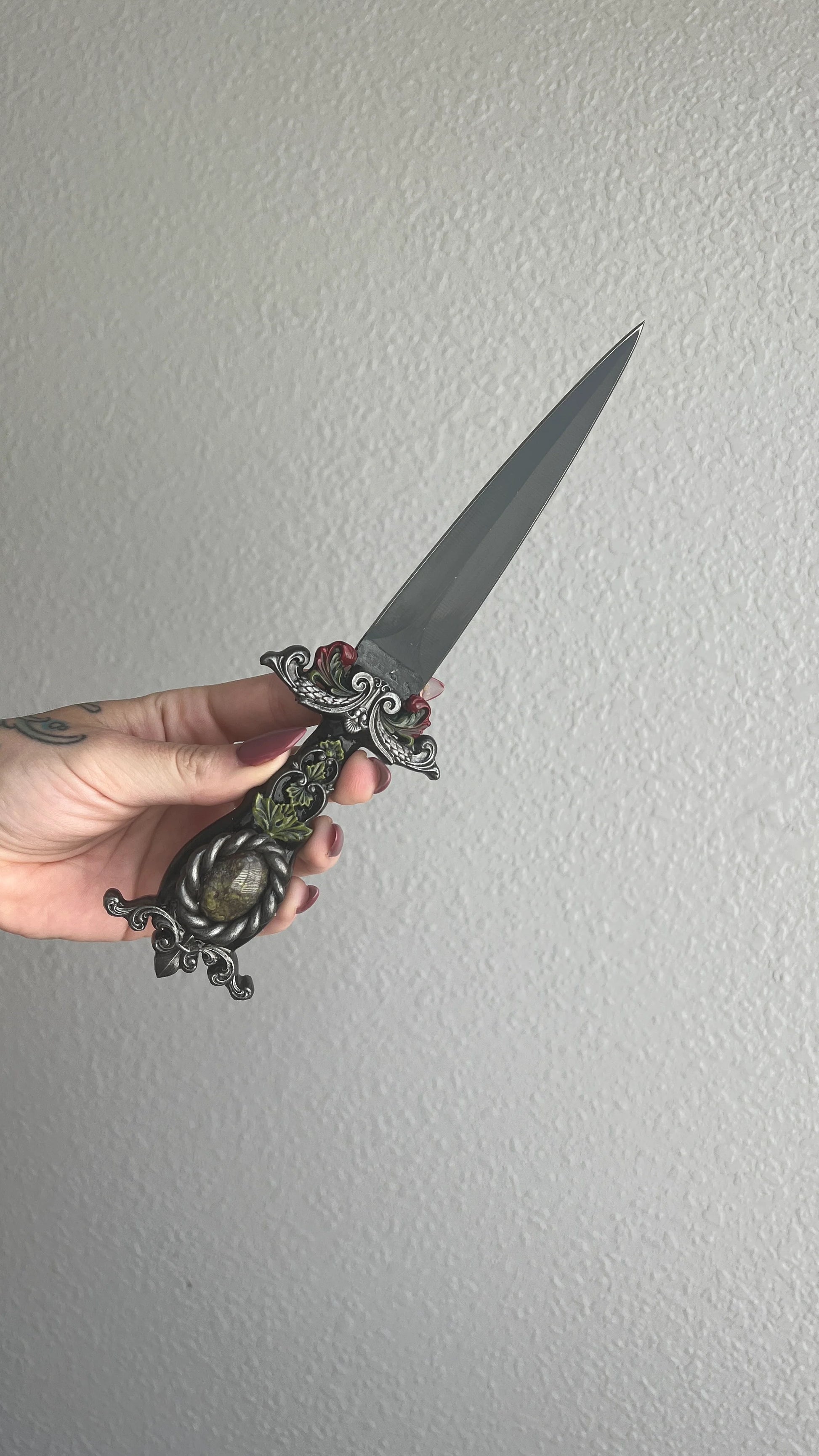 Hand-sculpted from clay and imbued with the power of old magic, the hilt of The Hermit is adorned with intricate details — twisted branches unfurling skyward, their gnarled forms stretching like the antlers of an ancient forest guardian. Sweeping leaves, curling vines, and a delicate lattice of sculpted scales weave together along its form, creating a living tapestry of root, stone, and spirit, breathing with the hidden magic of wild places. Cradled within its form rests your chosen semi-precious gemstone — a glistening amethyst, a shimmering labradorite, a soft rose quartz, or another stone of enchantment. The setting feels almost organic, as if the dagger itself grew around the crystal over centuries of slumber.
