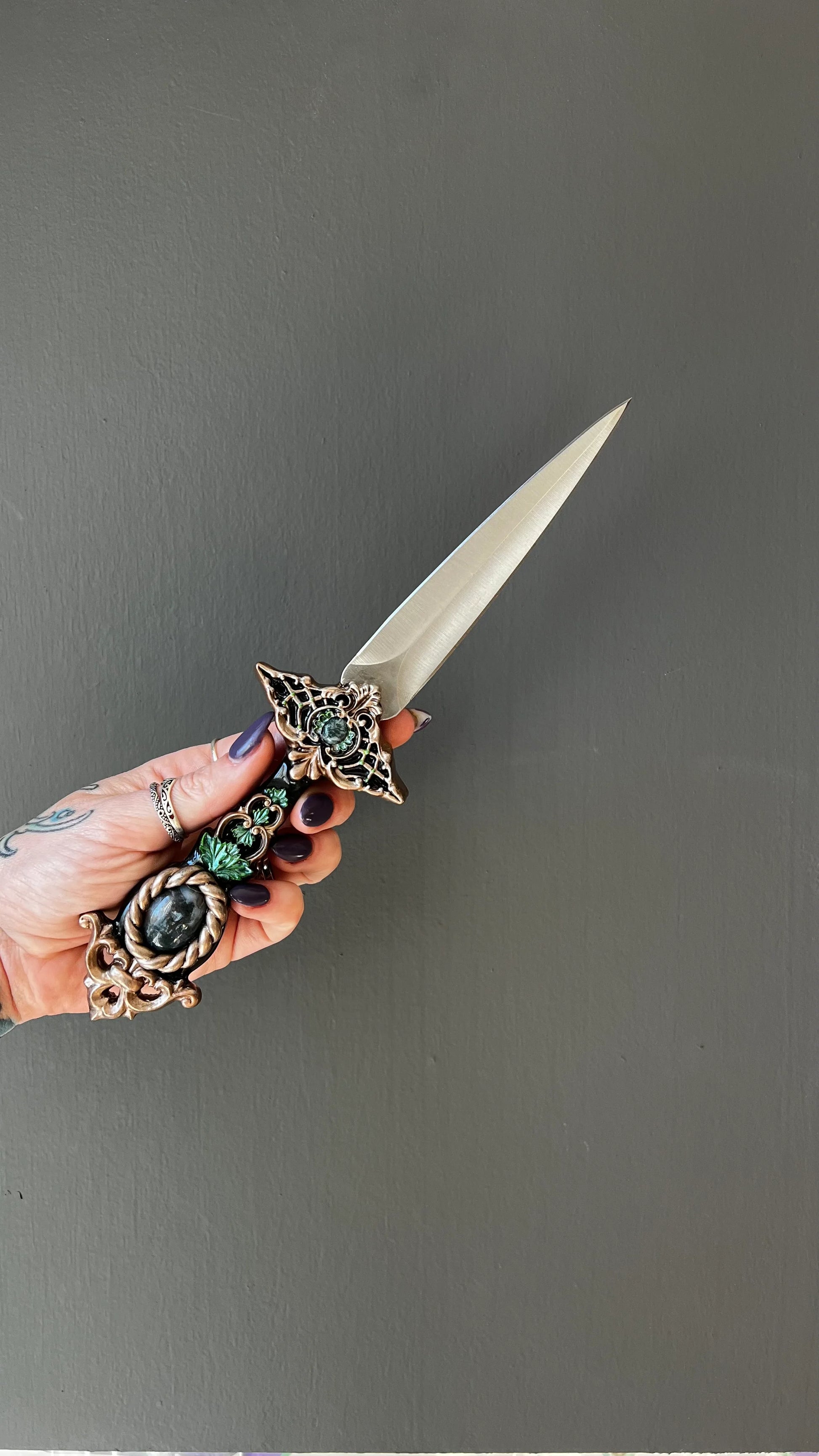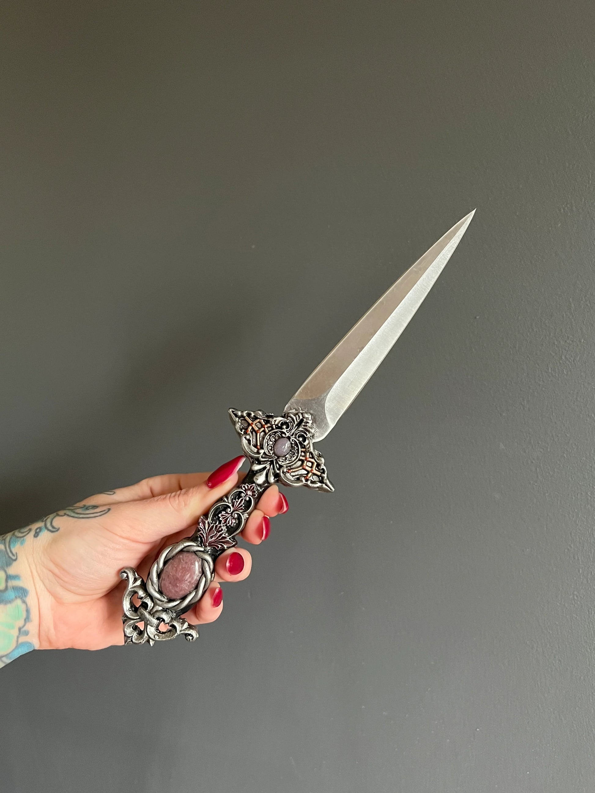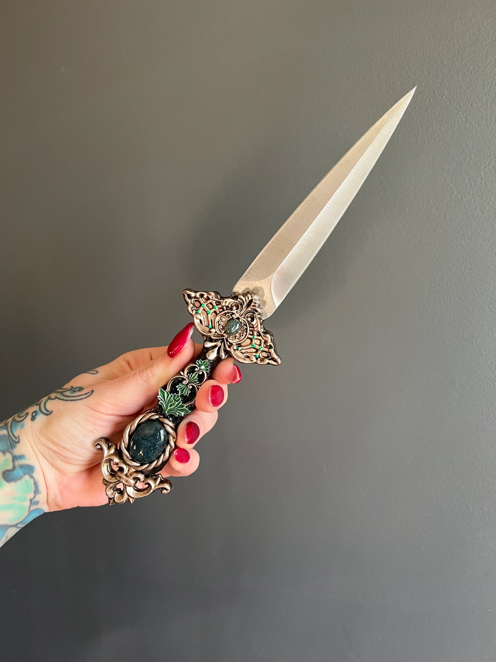 Hand-sculpted from clay and steeped in the breath of ancient earth, the hilt of The Huntress is adorned with sweeping branches and curling leaves, their wild forms entwining in a silent dance down the handle. Winding patterns twist like old roots along weathered stone, gathering near the base in a living tapestry of wood and spirit, as if the blade had slumbered for centuries within the heart of a sacred forest. Cradled within its form rests your chosen semi-precious gemstone — a glistening amethyst, a shimmering labradorite, a soft rose quartz, or another stone of enchantment. The setting feels almost organic, as if the dagger itself grew around the crystal over centuries of slumber.