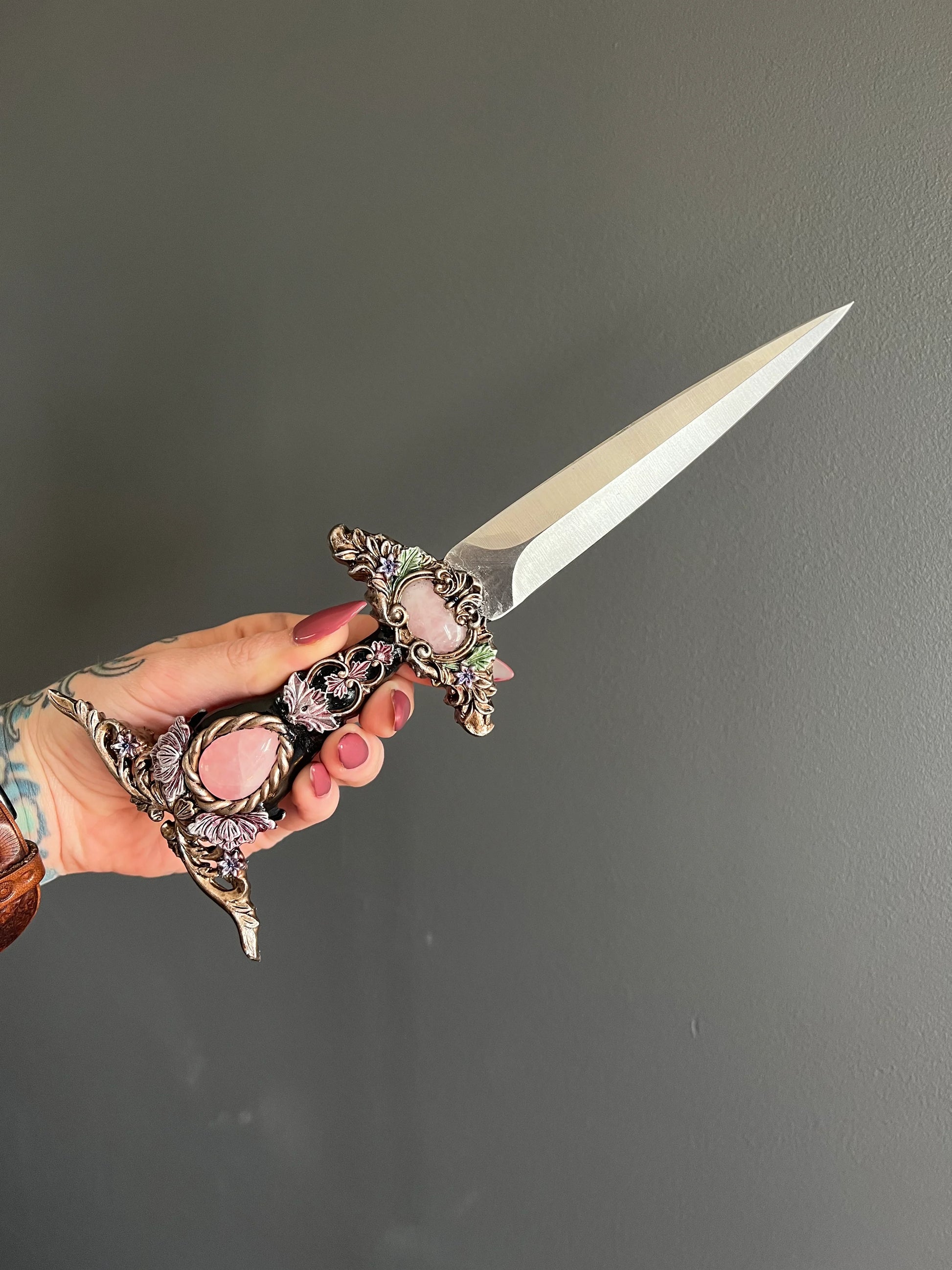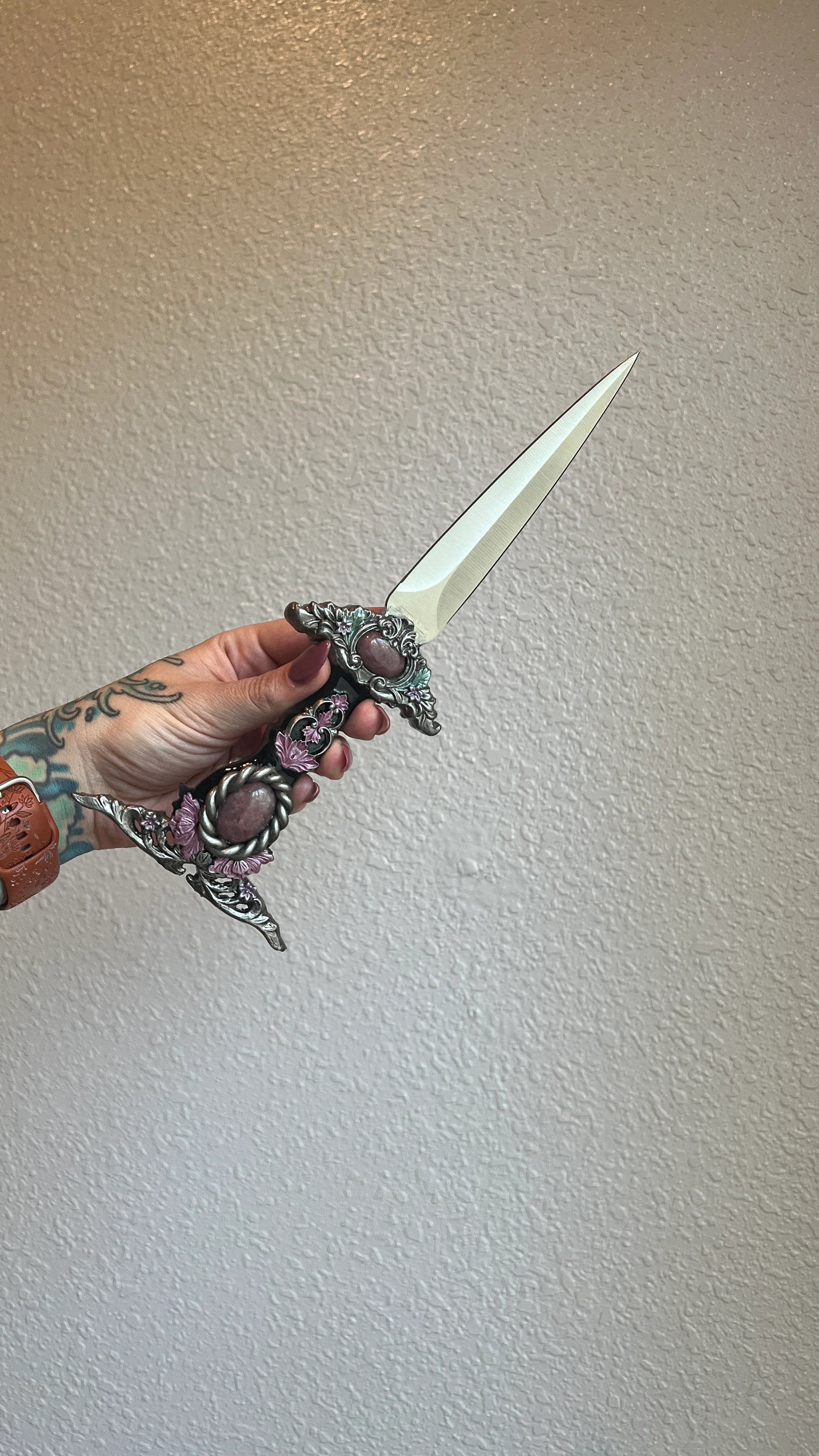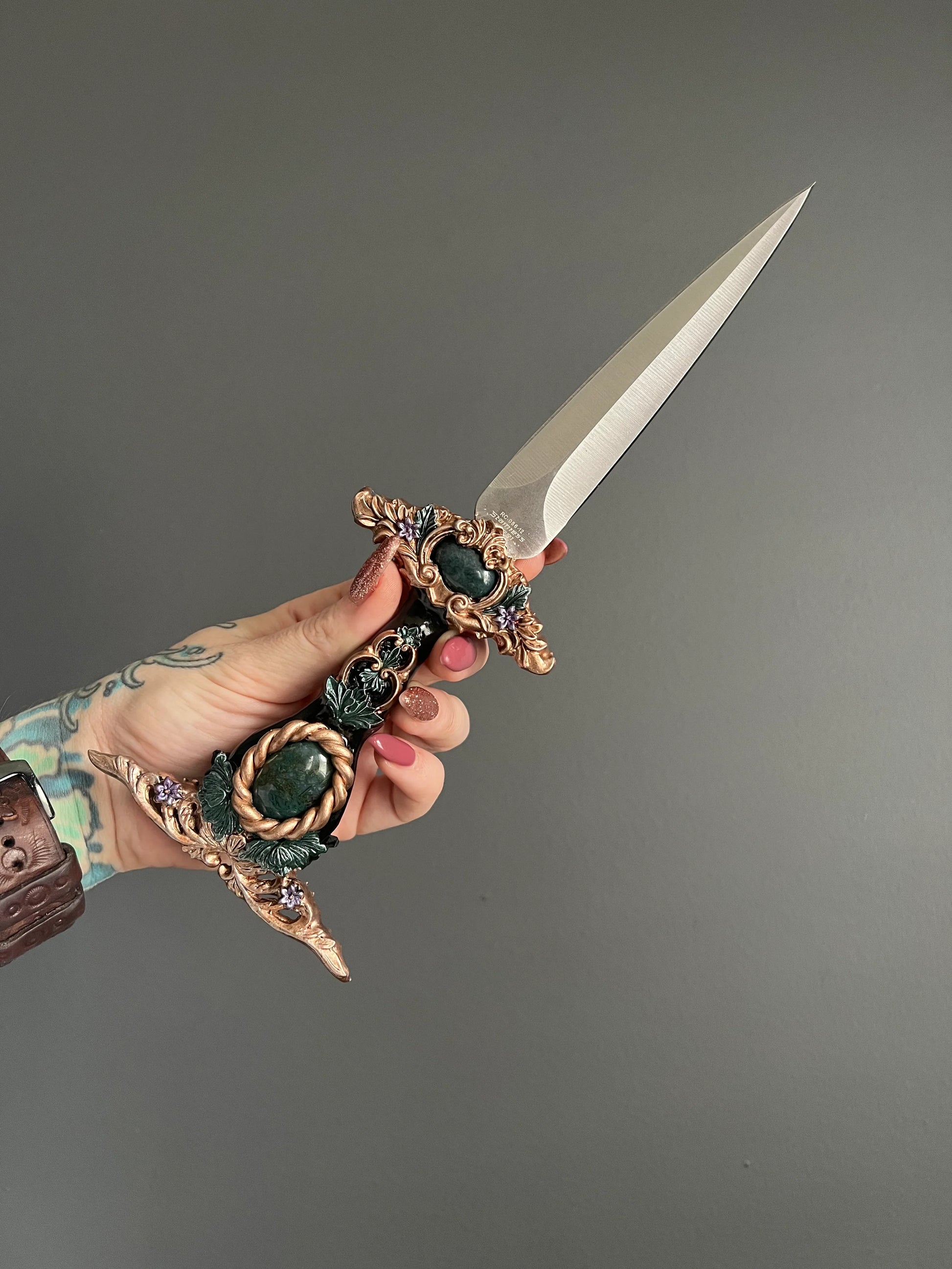 Hand-sculpted from clay and steeped in the forgotten magic of hidden groves, the hilt of The Jude is adorned with intricate, otherworldly details — twisted roots, winding branches, and flowers in eternal bloom. Cradled within its form rests your chosen semi-precious gemstone — a glistening amethyst, a shimmering labradorite, a soft rose quartz, or another stone of enchantment. The setting feels almost organic, as if the dagger itself grew around the crystal over centuries of slumber.