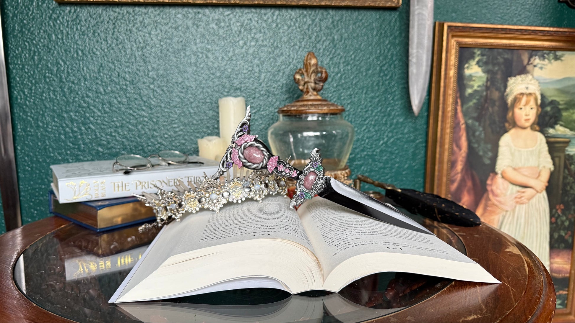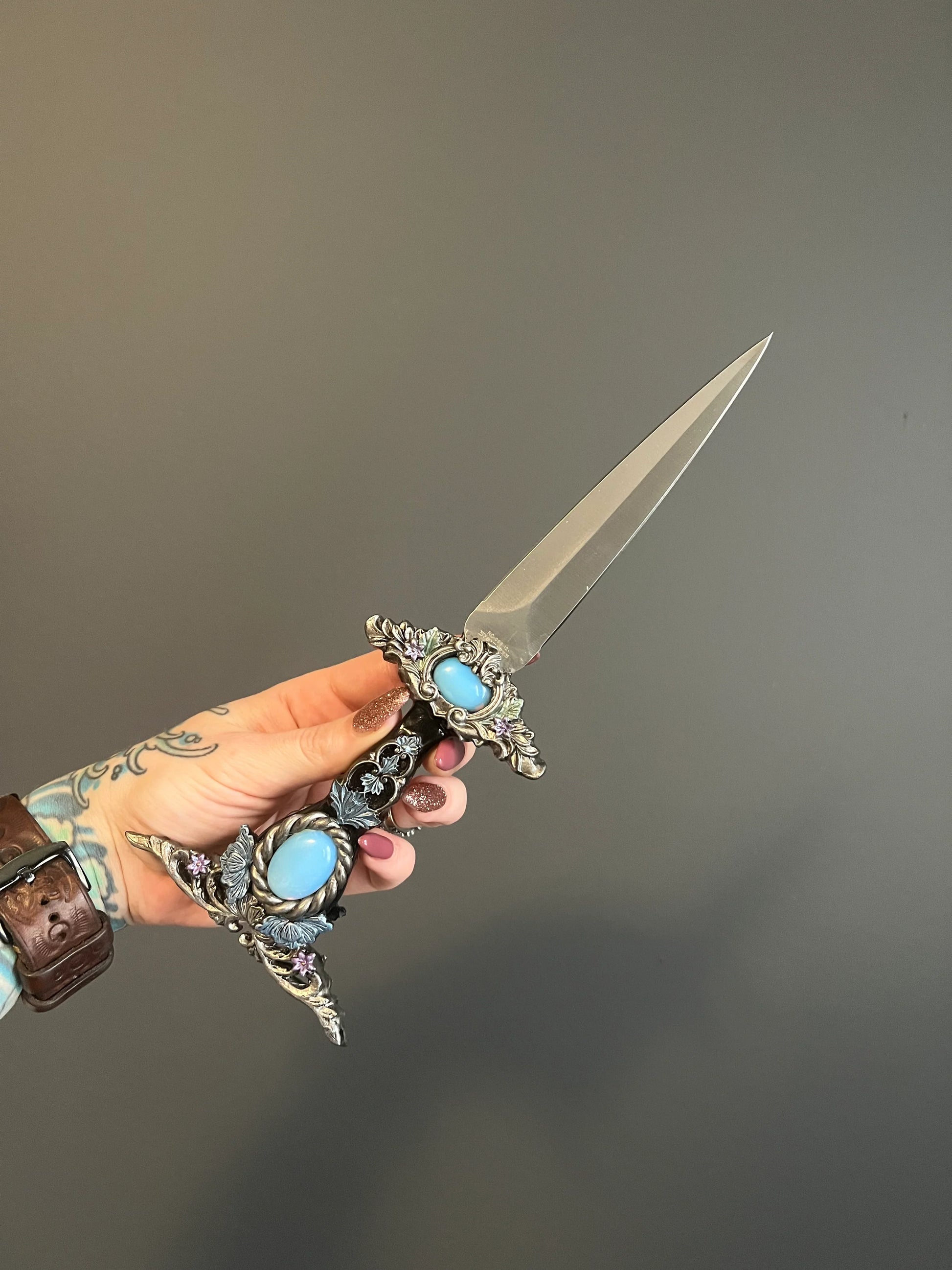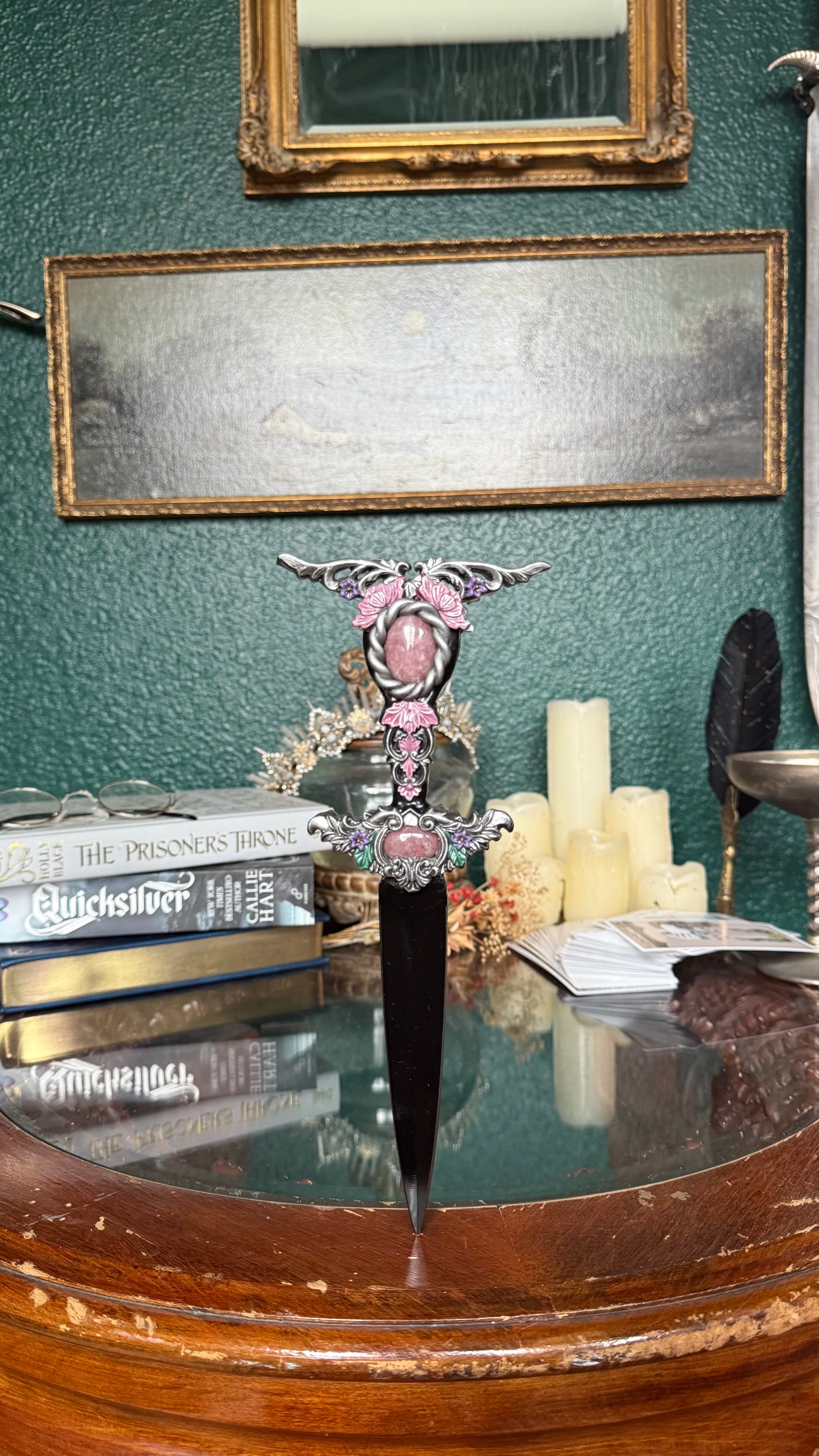 Hand-sculpted from clay and steeped in the forgotten magic of hidden groves, the hilt of The Jude is adorned with intricate, otherworldly details — twisted roots, winding branches, and flowers in eternal bloom. Cradled within its form rests your chosen semi-precious gemstone — a glistening amethyst, a shimmering labradorite, a soft rose quartz, or another stone of enchantment. The setting feels almost organic, as if the dagger itself grew around the crystal over centuries of slumber.