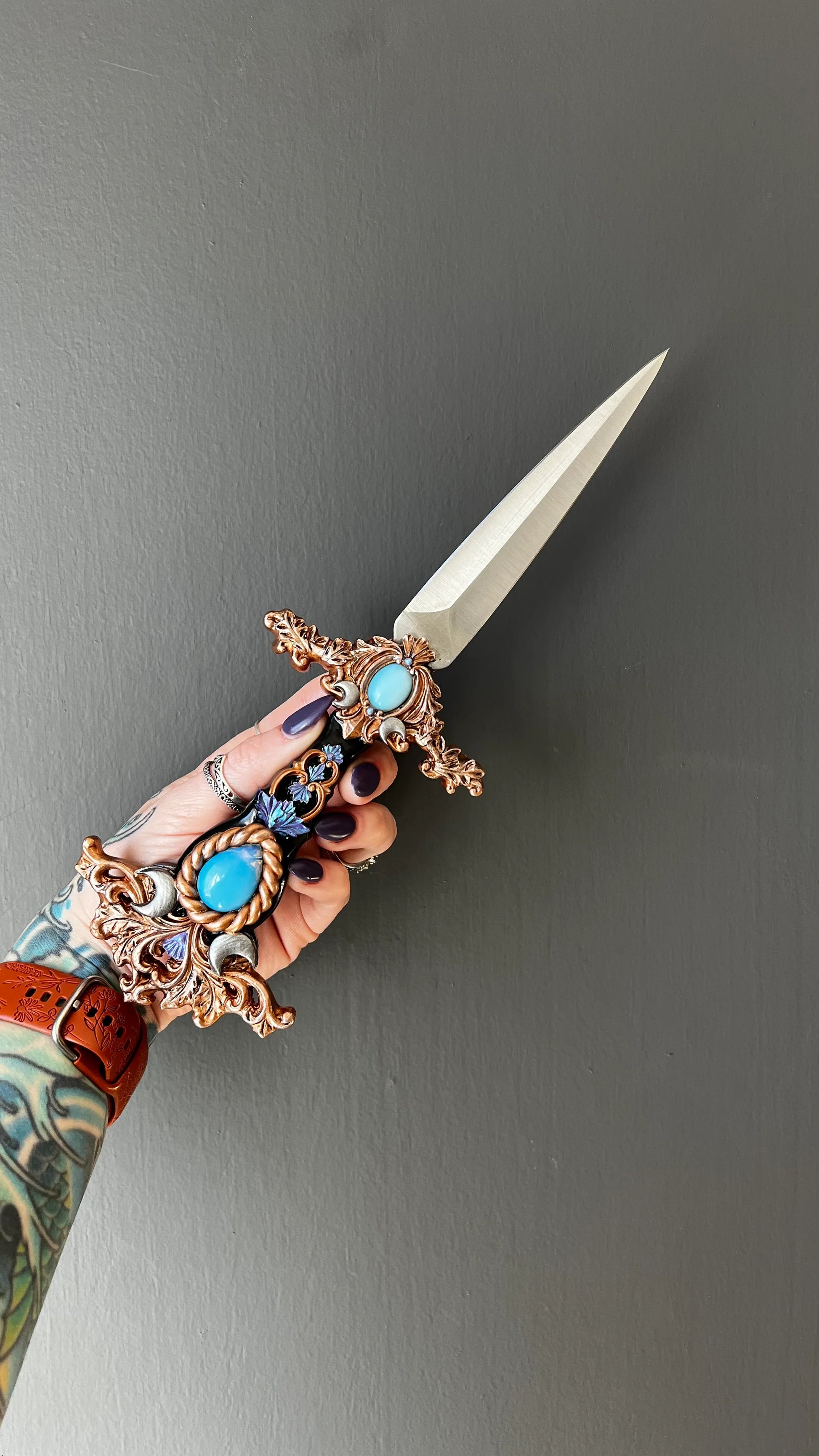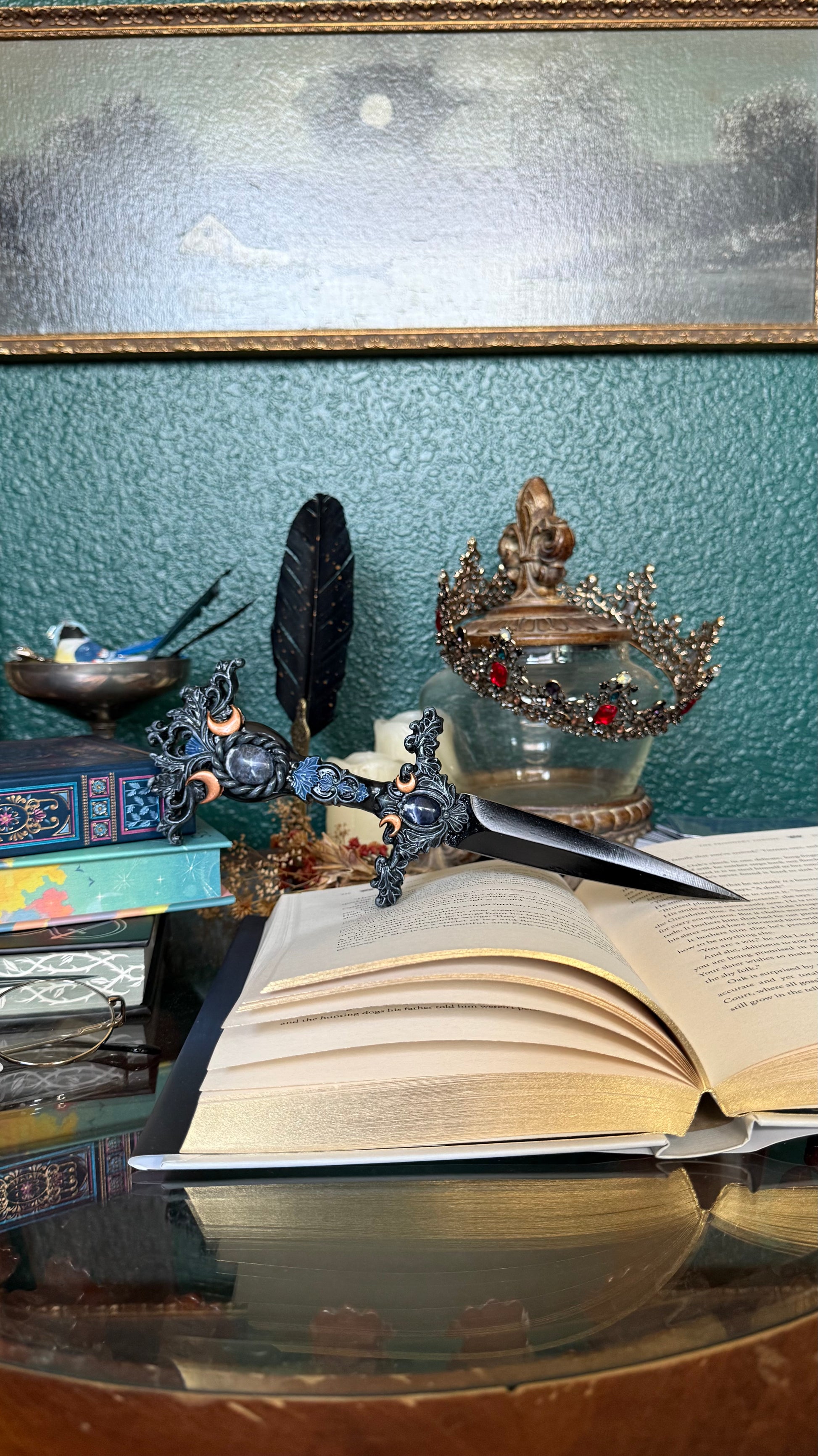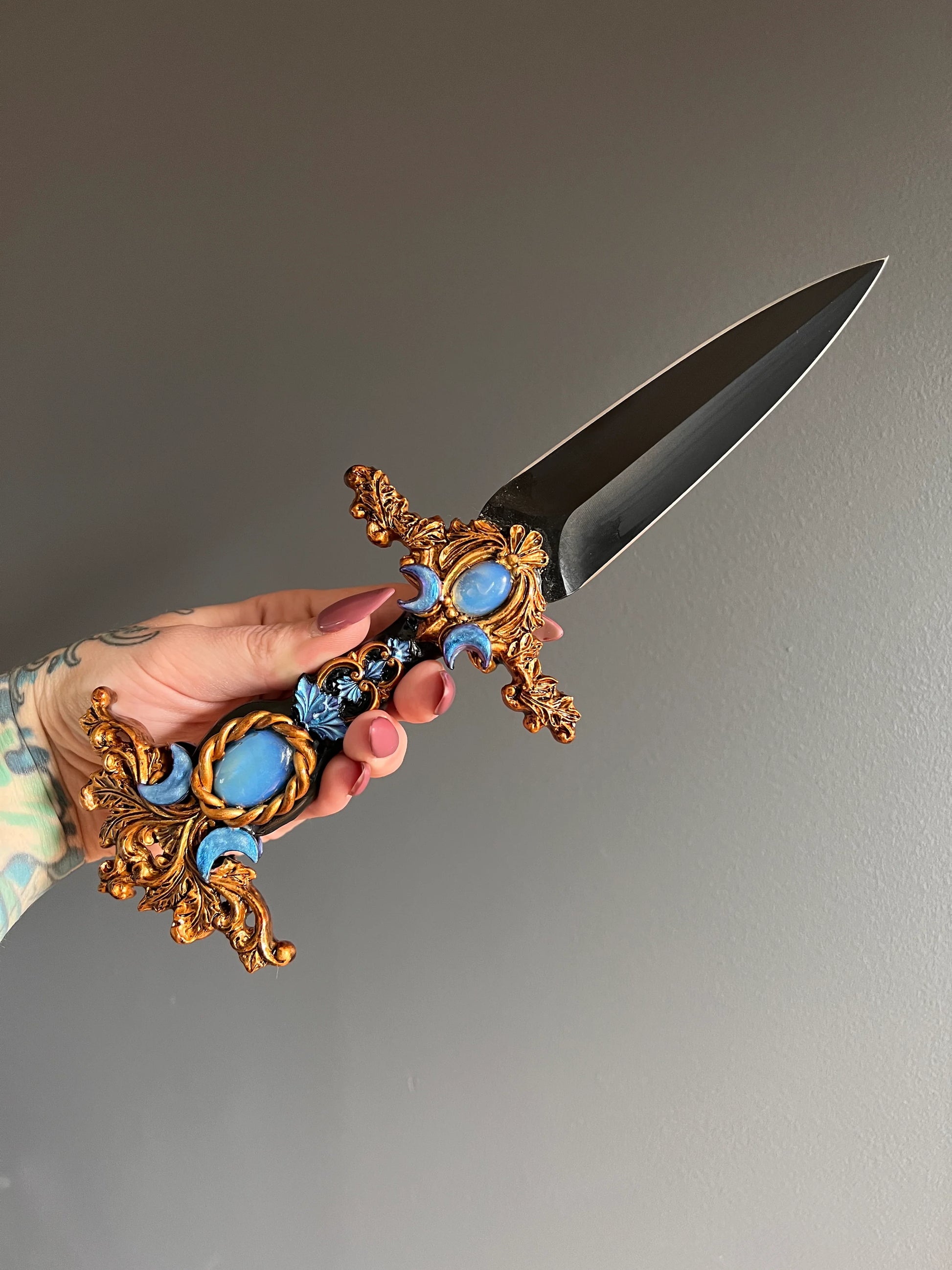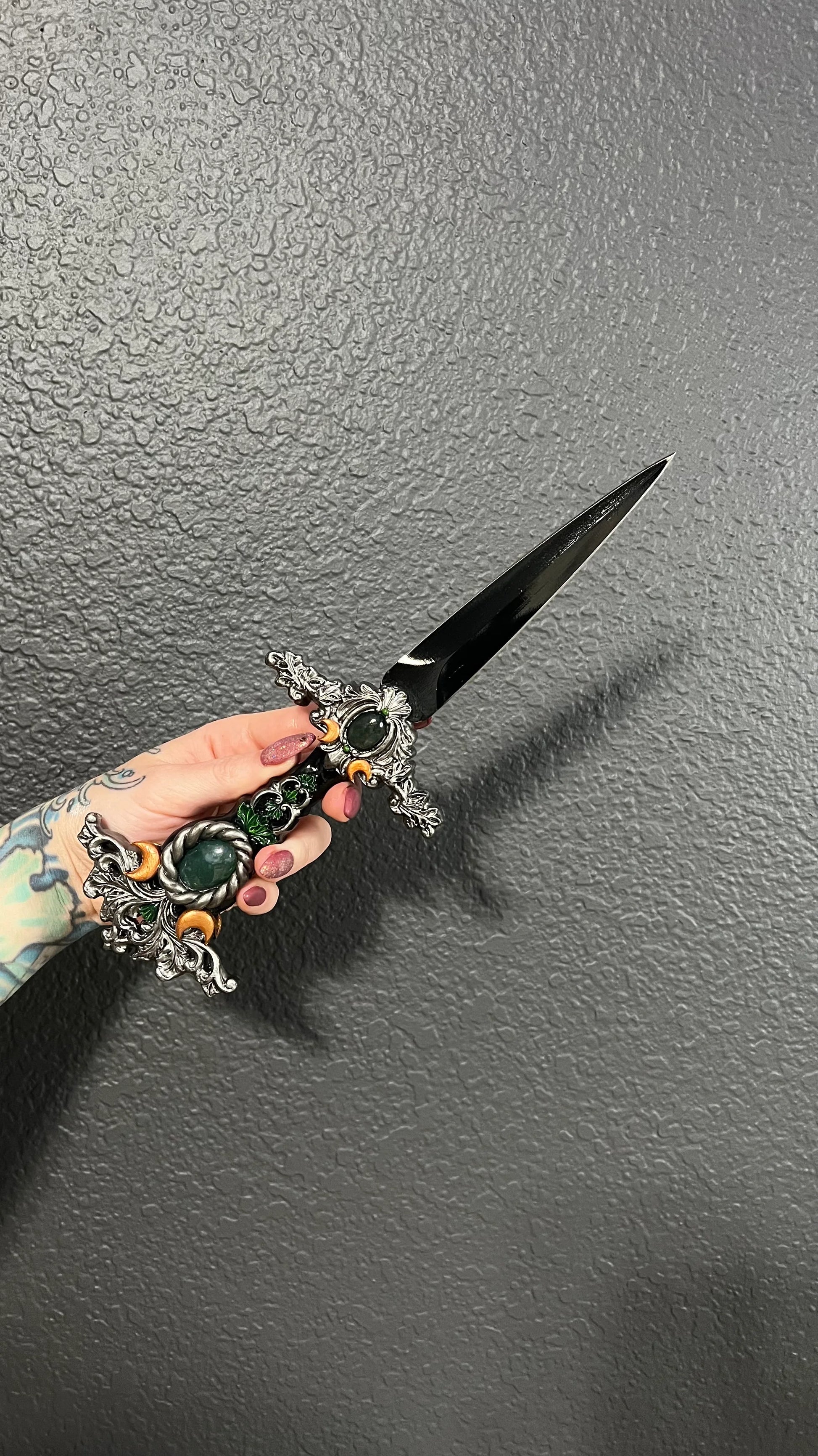 Hand-sculpted from clay and imbued with ancient celestial power, the hilt of The Lunar Enchantress is adorned with intricate details — crescent moons, twisted roots, and winding branches that whisper of forgotten rites and worship. Cradled within its ethereal form rests your chosen semi-precious gemstone — a glistening amethyst, a shimmering labradorite flashing with spectral blues, a soft rose quartz glowing like the first light of dawn, or another enchanted stone. The setting feels almost organic, as though the dagger had slept for centuries beneath a sacred moon, and slowly grew around the stone's ancient heart.