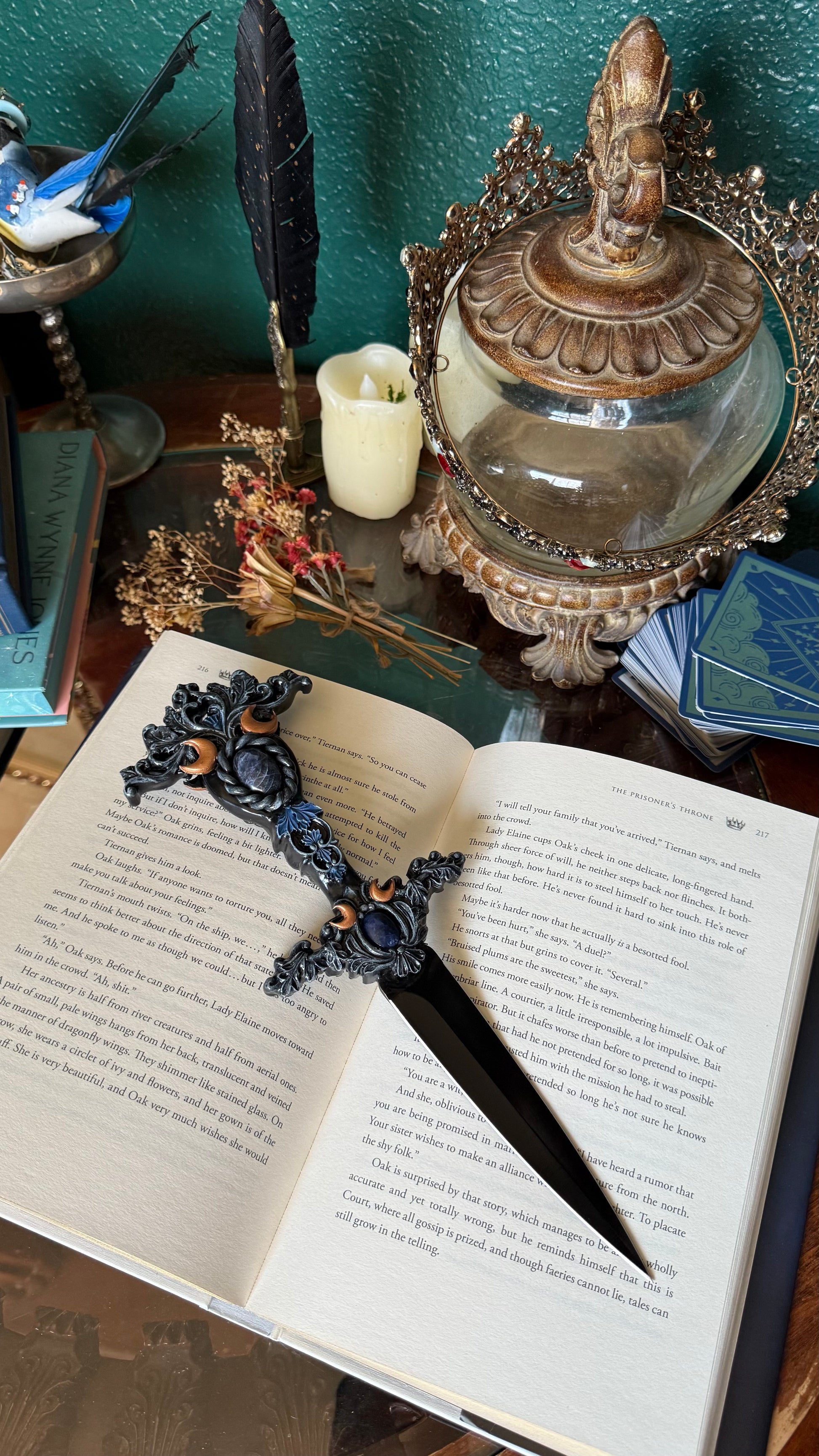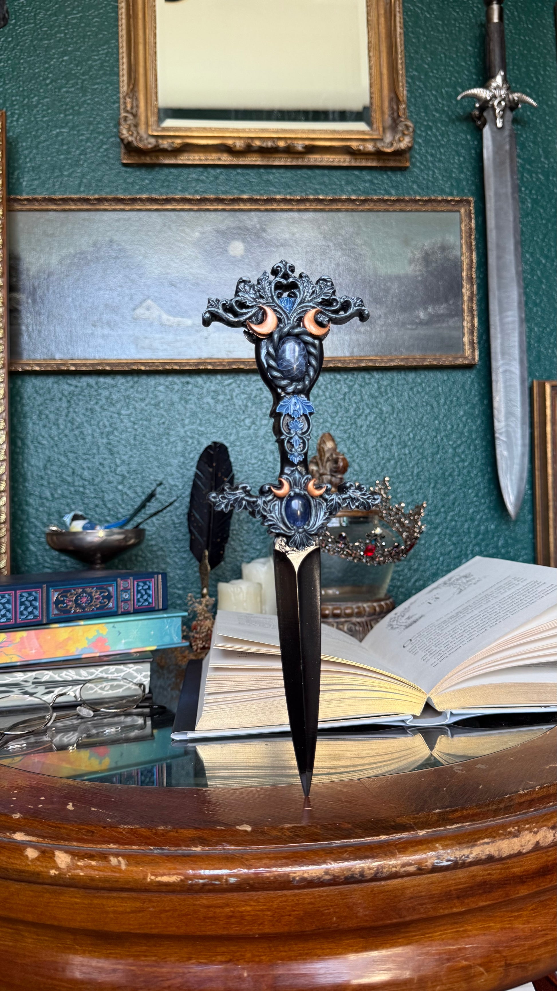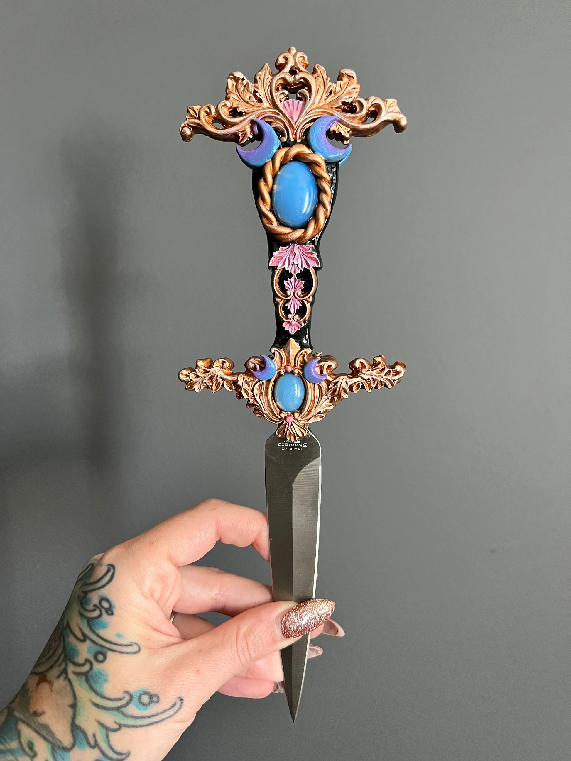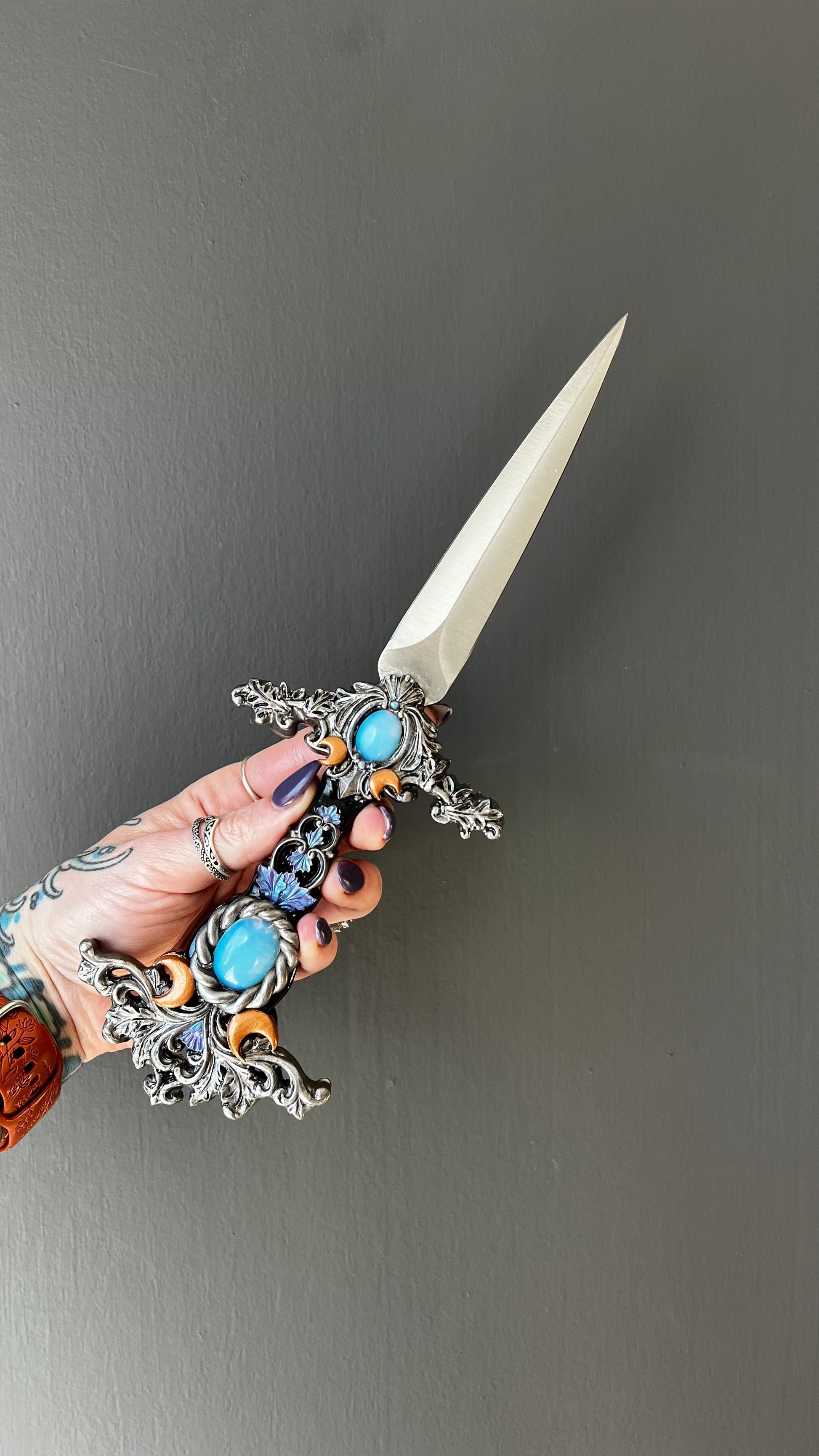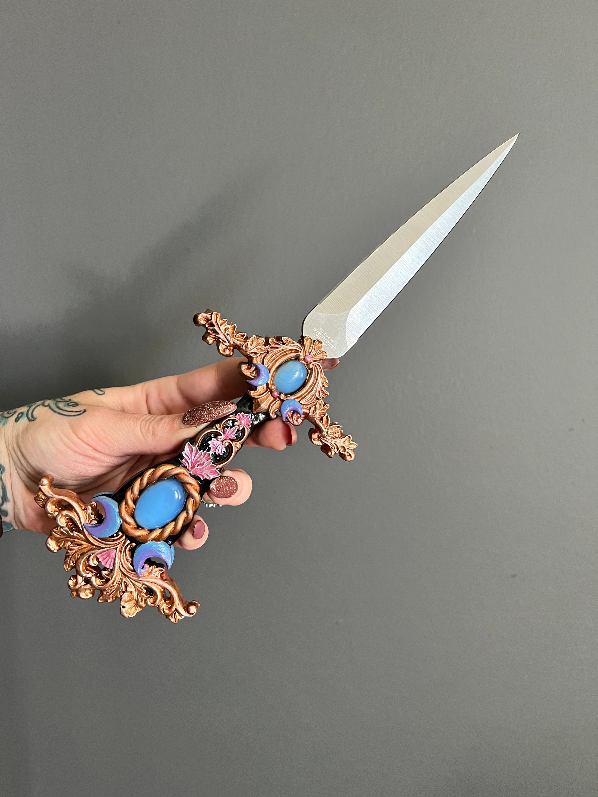 Hand-sculpted from clay and imbued with ancient celestial power, the hilt of The Lunar Enchantress is adorned with intricate details — crescent moons, twisted roots, and winding branches that whisper of forgotten rites and worship. Cradled within its ethereal form rests your chosen semi-precious gemstone — a glistening amethyst, a shimmering labradorite flashing with spectral blues, a soft rose quartz glowing like the first light of dawn, or another enchanted stone. The setting feels almost organic, as though the dagger had slept for centuries beneath a sacred moon, and slowly grew around the stone's ancient heart.
