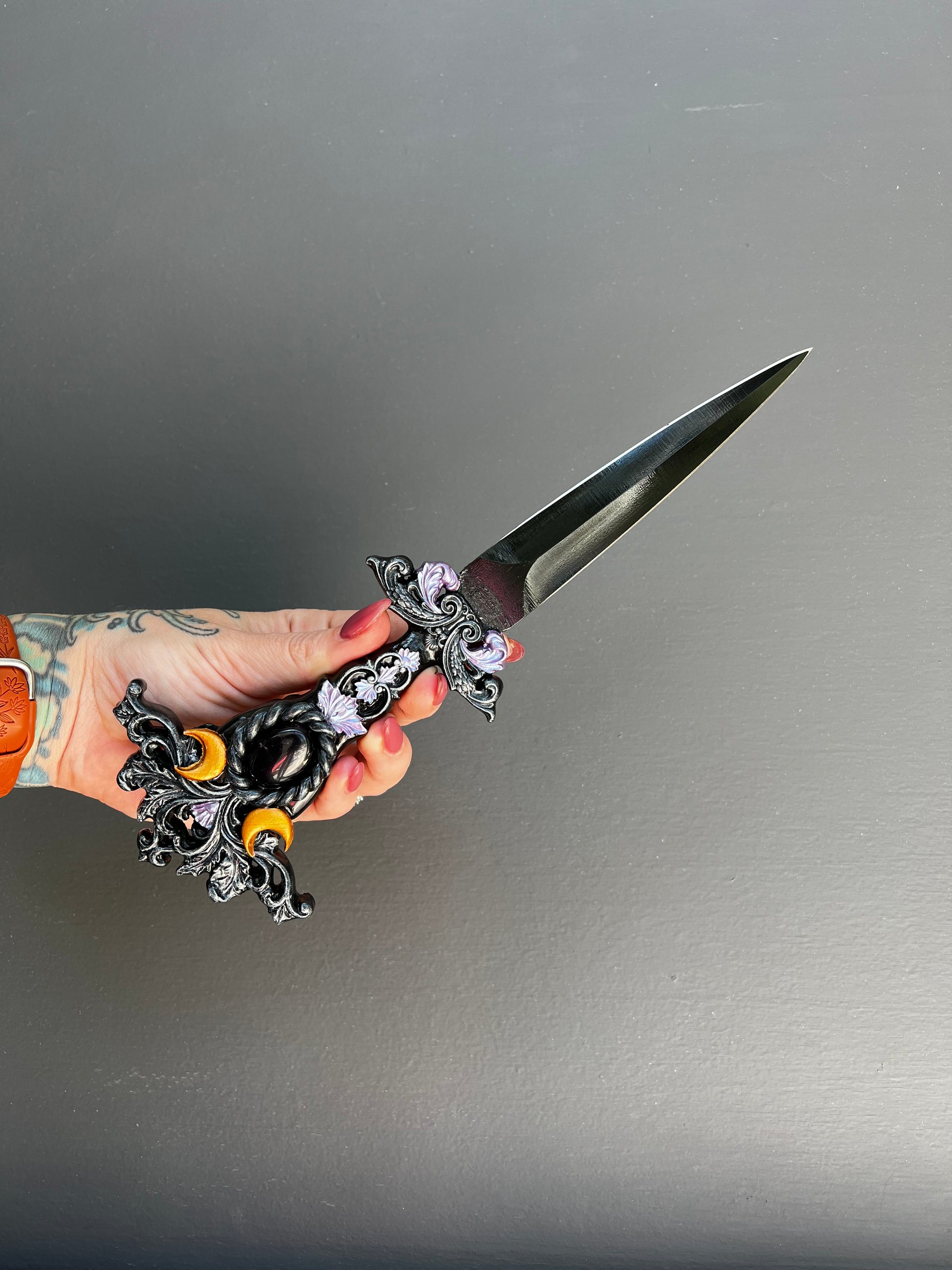 Hand-sculpted from clay and imbued with ancient celestial power, the hilt of The Sorceress is adorned with intricate details — crescent moons,winding branches and dragon scales that weave together into a tapestry of forgotten magic and primal strength. Cradled within its form rests your chosen semi-precious gemstone — a glistening amethyst, a shimmering labradorite, a soft rose quartz, or another stone of enchantment. The setting feels almost organic, as if the dagger itself grew around the crystal over centuries of slumber.